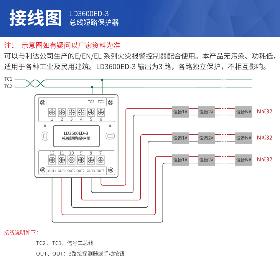 LD3600ED-3主要用于火災報警控制器的二總線回路中,隔離線路中的短路點,保證線路中的其他設備的正常運行。可以與利達公司生產的E/EN/EL系列火災報警控制器配合使用。本產品無污染、功耗低,適用于各種工業(yè)及民用建筑。LD3600ED-3輸出為3路,各路獨立保護,不相互影響。 二、LD3600ED-3總線短路保護器功能特點 1、二總線,無極性,不占地址點。 2、不需要外接電源。 3、單向使用。 4、綠色指示工作,紅色指示短路。